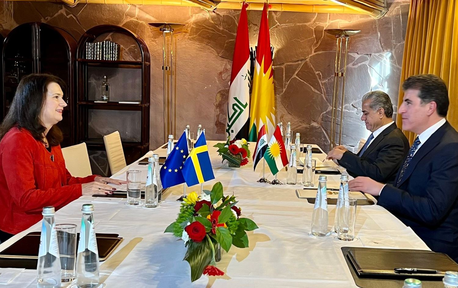 Kurdistan Region President Nechirvan Barzani (right) meets with Swedish FM Ann Linde (left) in Munich on February 19, 2022. Photo: handout