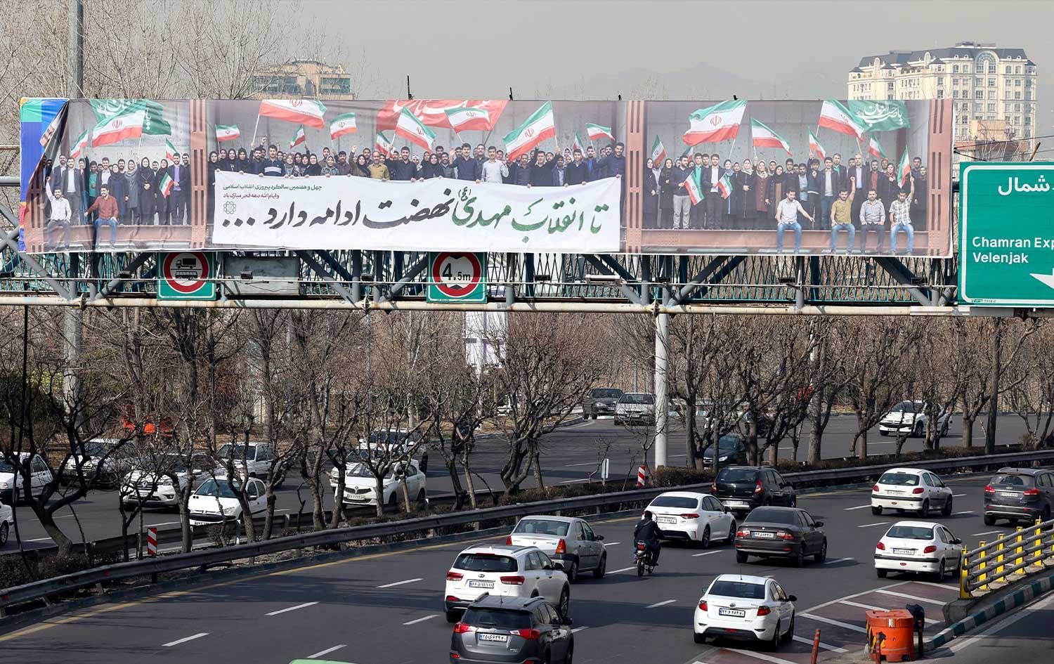 Vehicles drive along a highway under a pedestrian bridge with a huge banner showing people waving the Iranian flag, in Tehran on February 18, 2026. Photo: AFP