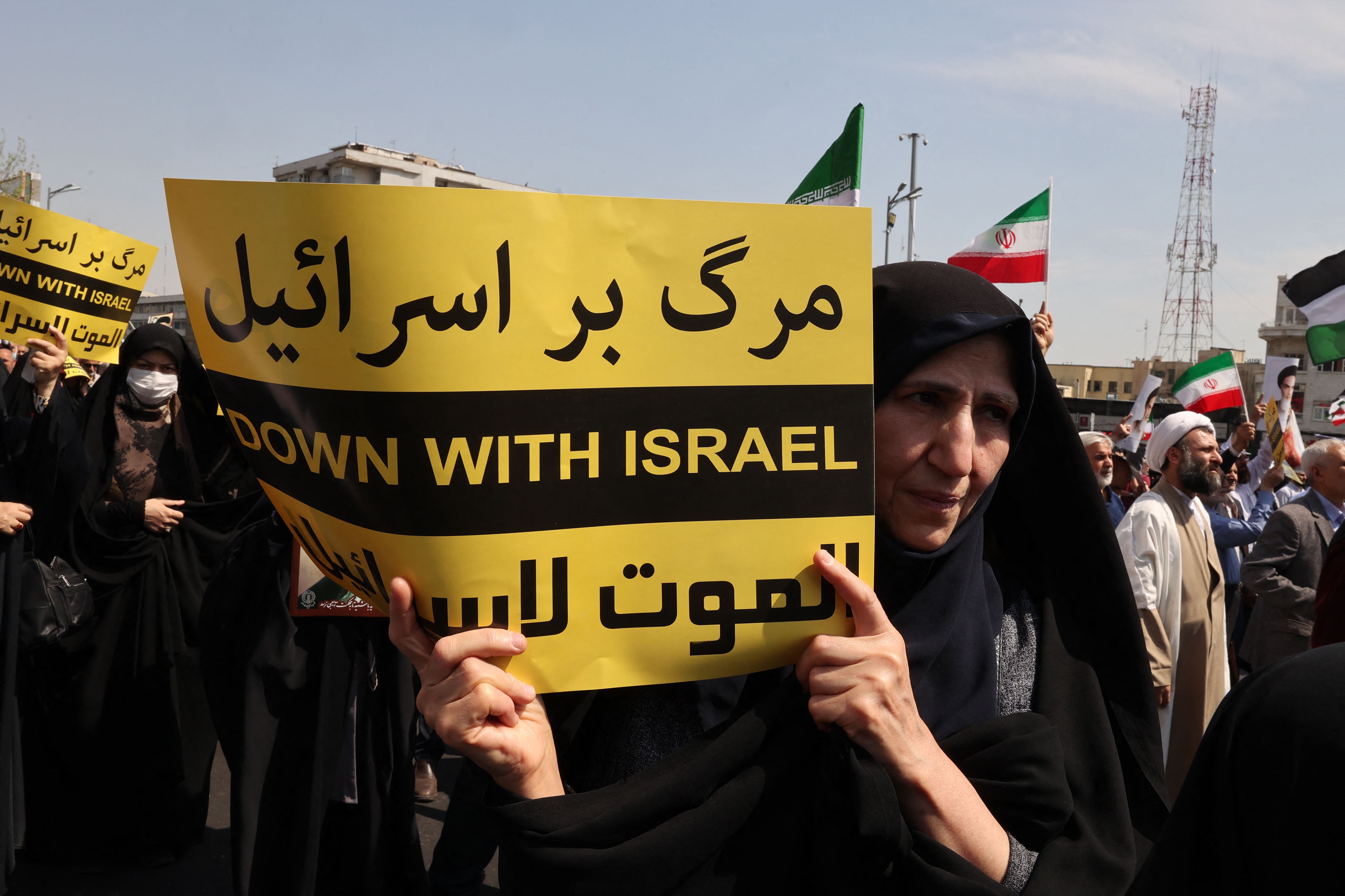 Iranians wave the flags of Palestine and Iran they gather during an anti-Israel demonstration after the Friday noon prayer in Tehran on April 19, 2024. Photo: AFP