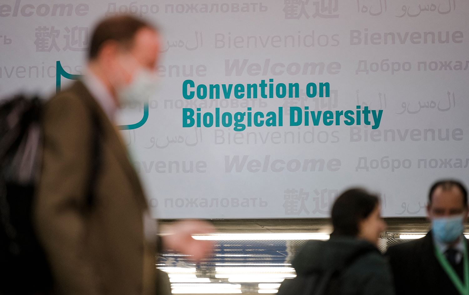 People walk in front of the convention sign at the UN Biodiversity Conference (COP15) in Montreal, Quebec, Canada, on December 17, 2022. Photo: AFP