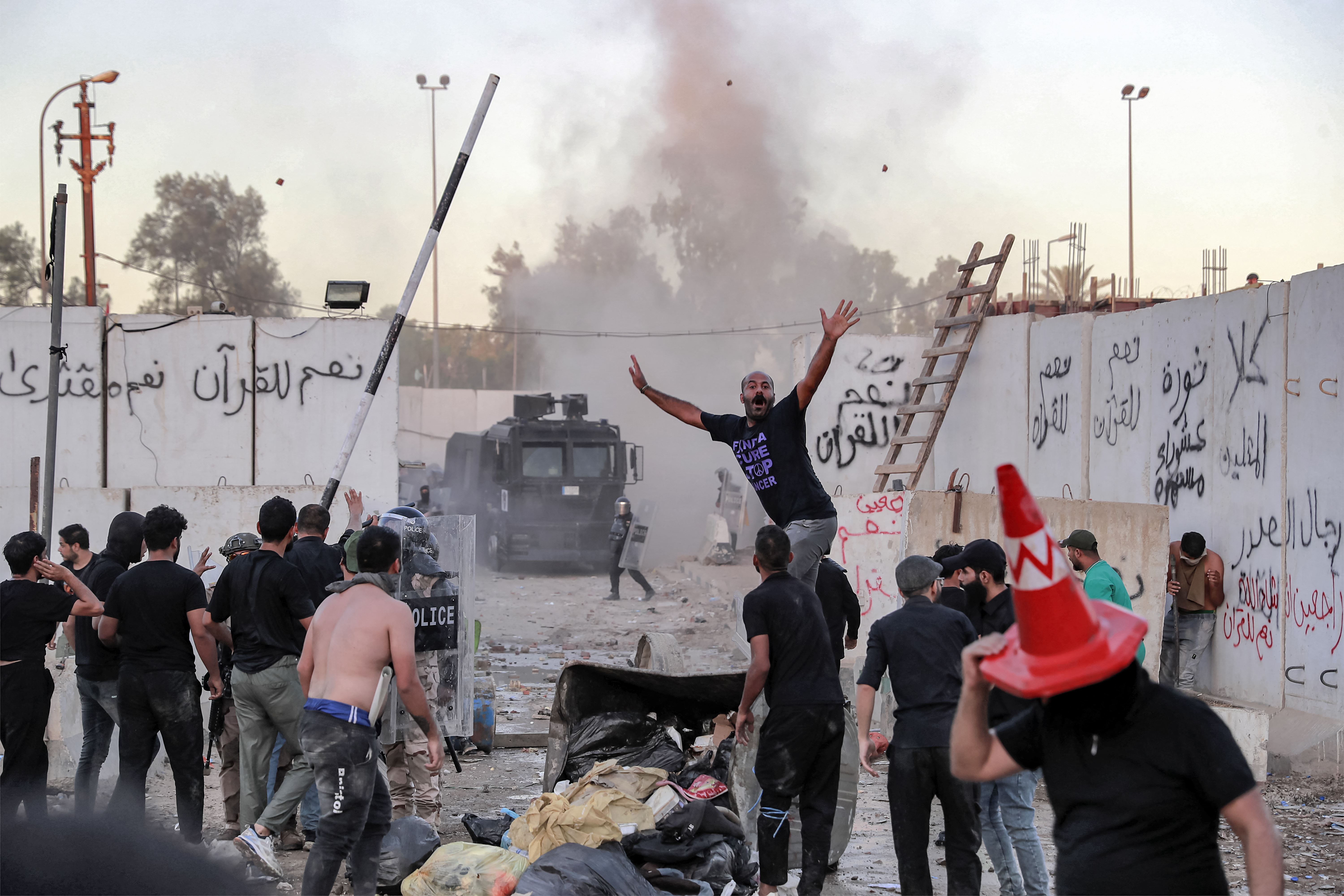 Iraqi riot police try to disperse supporters of Iraqi Shiite cleric Muqtada al-Sadr gathering for a protest outside the Swedish embassy in Baghdad on July 20, 2023. Photo: AFP