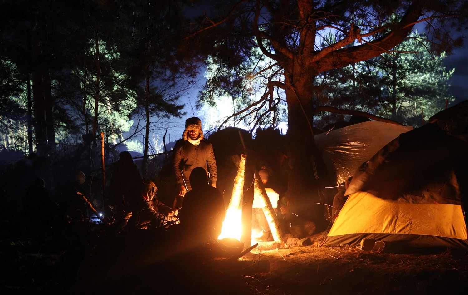 A group of migrants rest by a fire at a camp near the Belarusian-Polish border in the Grodno region on November 13, 2021. Photo: Leonid Shchleglov / AFP