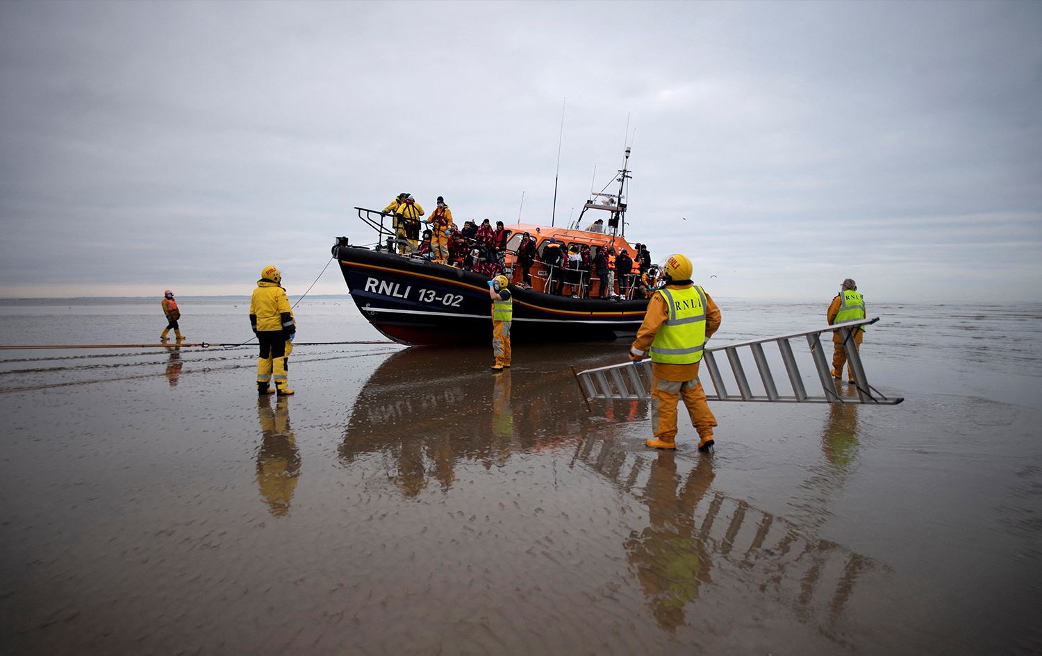 In this file photo taken on December 16, 2021 members of the RNLI (Royal National Lifeboat Institution) prepare to help migrants ashore off an RNLI lifeboat at a beach in Dungeness on the southeast coast of England. Photo: Ben Stansall/AFP