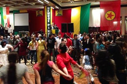 Soon after wishing everyone a happy New Year through the sound system, men and women lined up to dance under a ceiling adorned with pictures of Ocalan, the Kurdistan flag and that of his Kurdistan Workers Party (PKK).