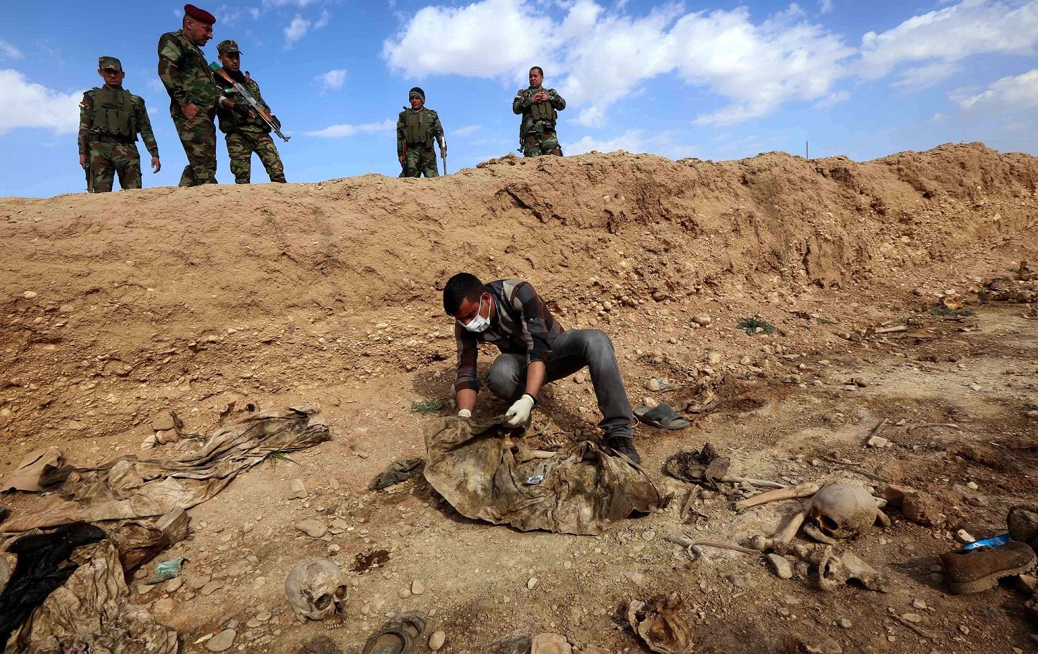 An Iraqi man inspects the remains of members of the Yezidi minority killed by the Islamic State (ISIS) group at a mass grave in Shingal, February 3, 2015. File photo: Safin Hamed / AFP