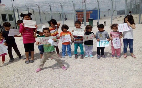 A number of children are seen in the pictures holding various slogans asking for the improvement of their lives: Where is humanity? Help. Freedom. Where is justice?