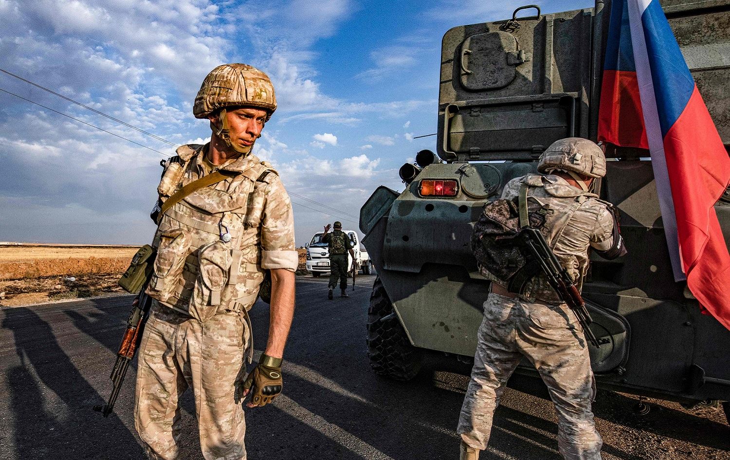 Russian military police stand outside an armored vehicle along a road in the countryside near the northeastern Syrian town of Amuda, Hasaka province, October 24, 2019. Photo: Delil Souleiman / AFP