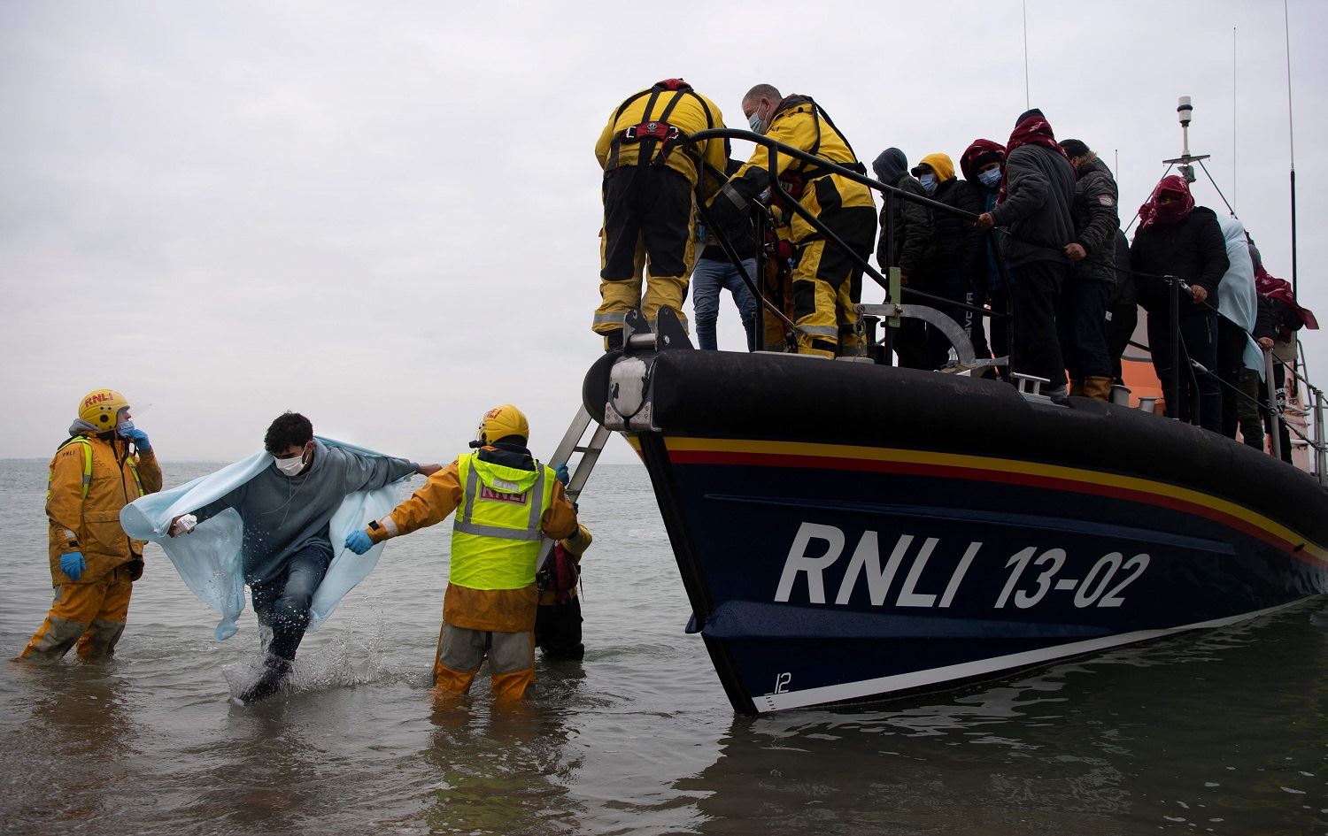 Migrants are helped ashore from a RNLI (Royal National Lifeboat Institution) lifeboat at a beach in Dungeness, on the south-east coast of England, on November 24, 2021, after being rescued while crossing the English Channel. Photo: Ben Stansall/AFP