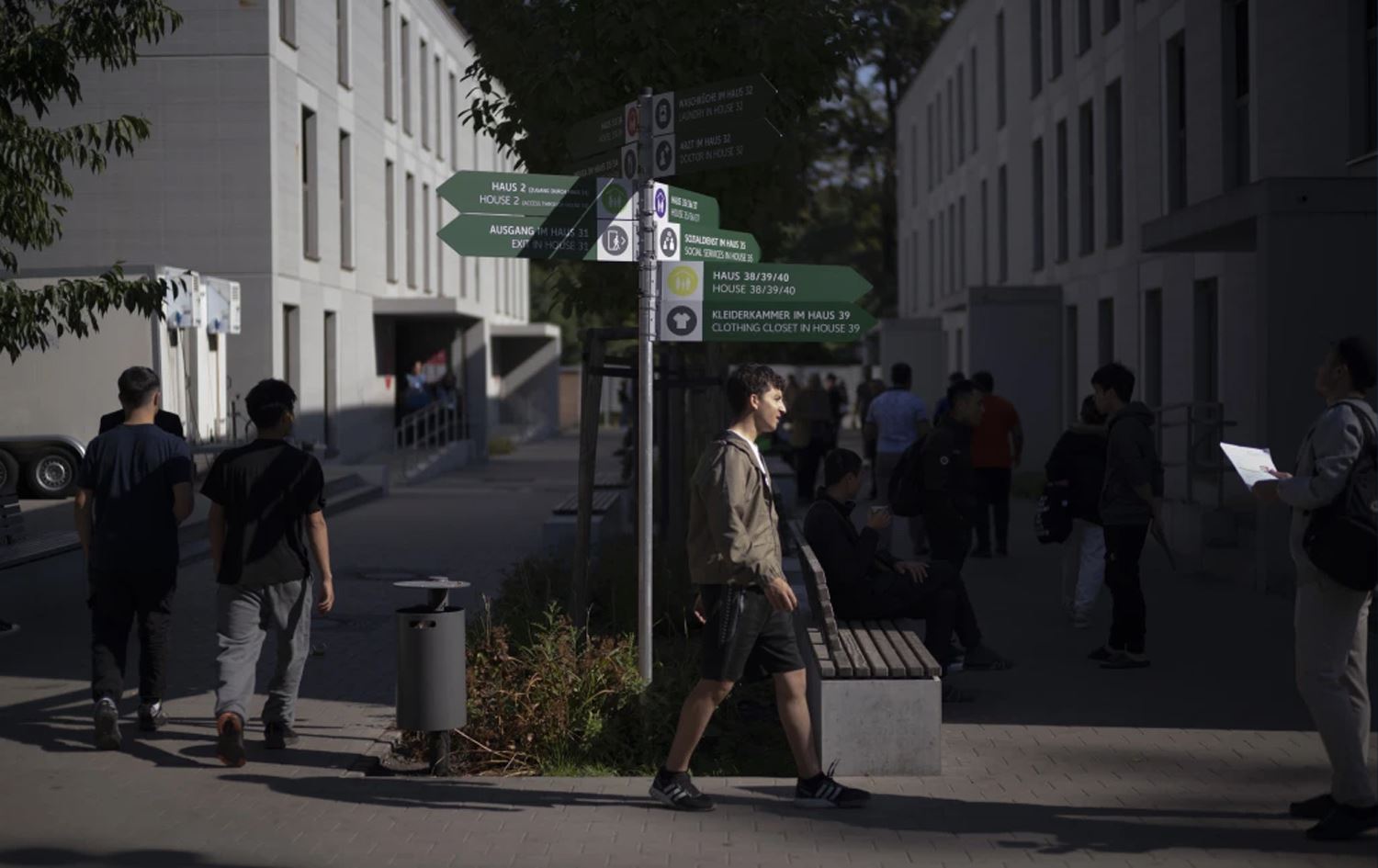 Service signs in German and English stand between shelter buildings for asylum seekers in Berlin, Germany, on September 25, 2023. Photo: Markus Schreiber / AP