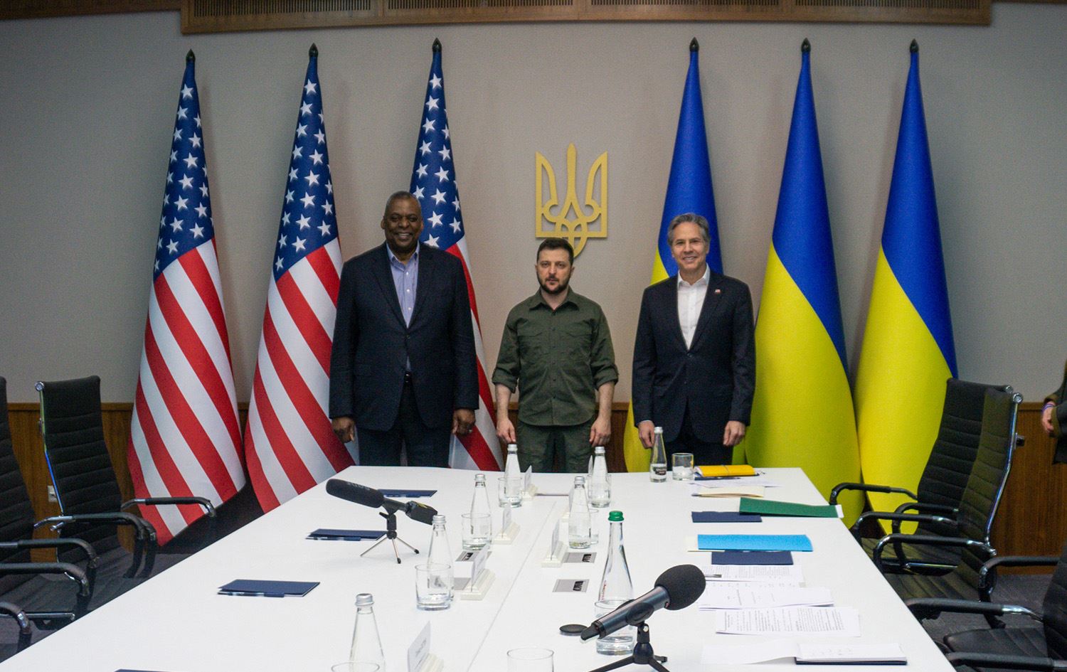 US Secretary of Defense Lloyd Austin (left) and Secretary of State Antony Blinken (right) meet with Ukrainian President Volodymyr Zelensky (center) on April 24, 2022 in Kyiv, Ukraine. Photo: AFP