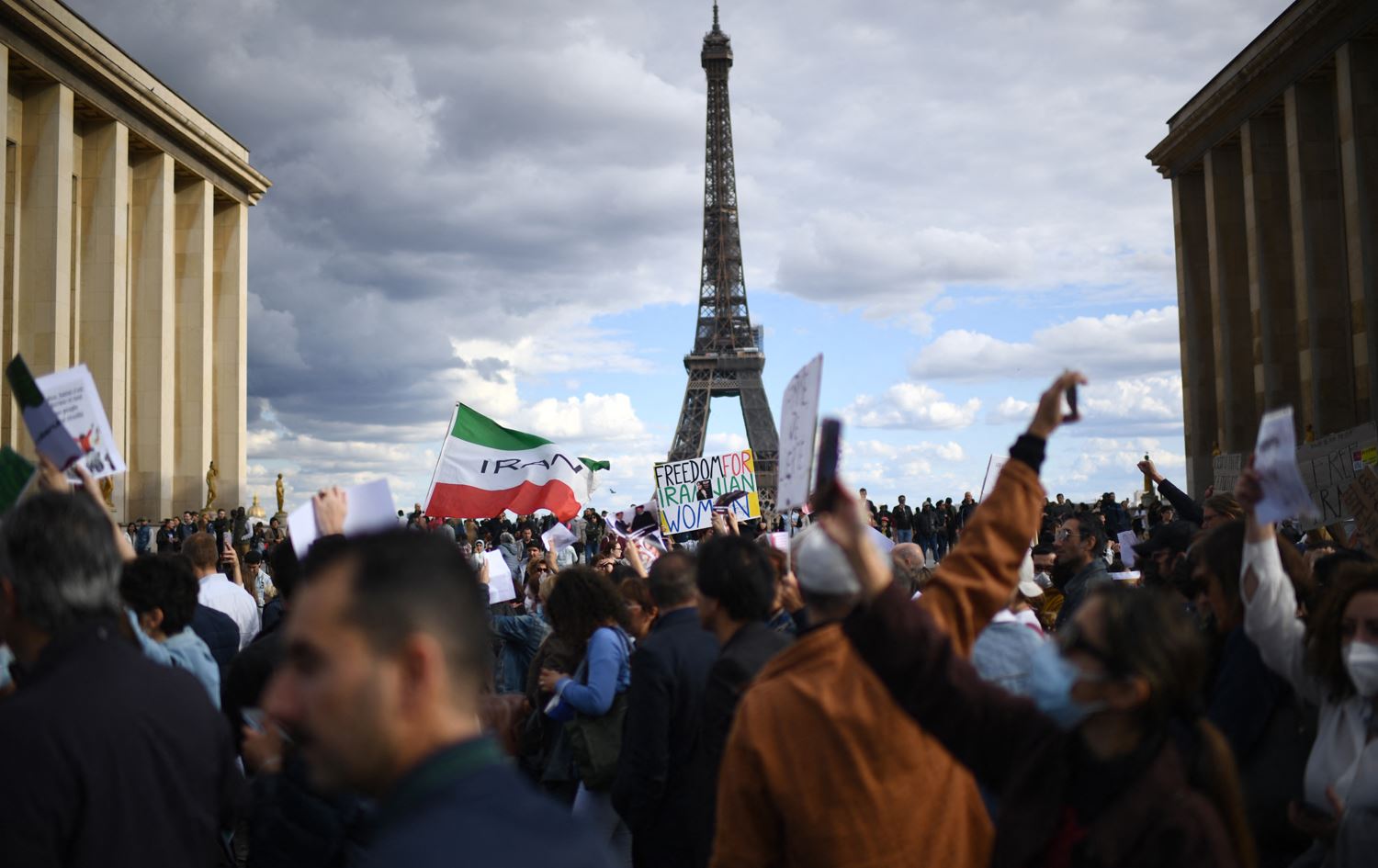 People take part in a demonstration in support of Iranian protesters at the Trocadero near the Eiffel tower in Paris, on September 25, 2022. Photo: Christophe Archambault/AFP