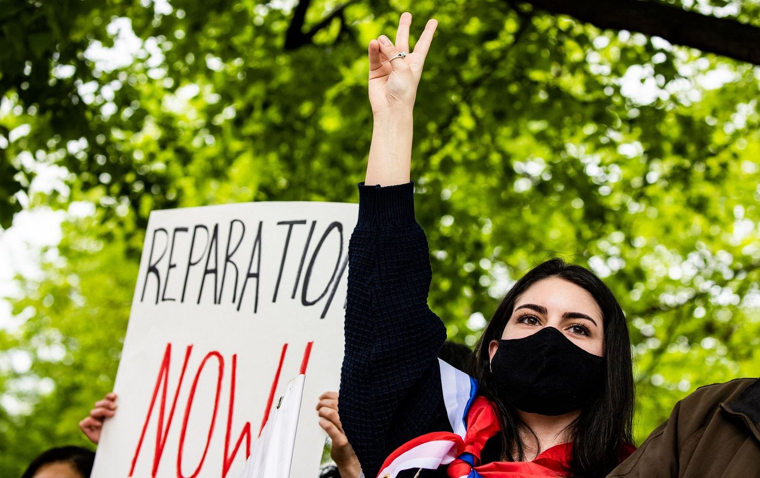 Armenians protest outside of the Turkish Ambassador's Residence on the 106th anniversary of the 1915 Armenian Genocide in Washington, DC on April 24, 2021. Photo: AFP