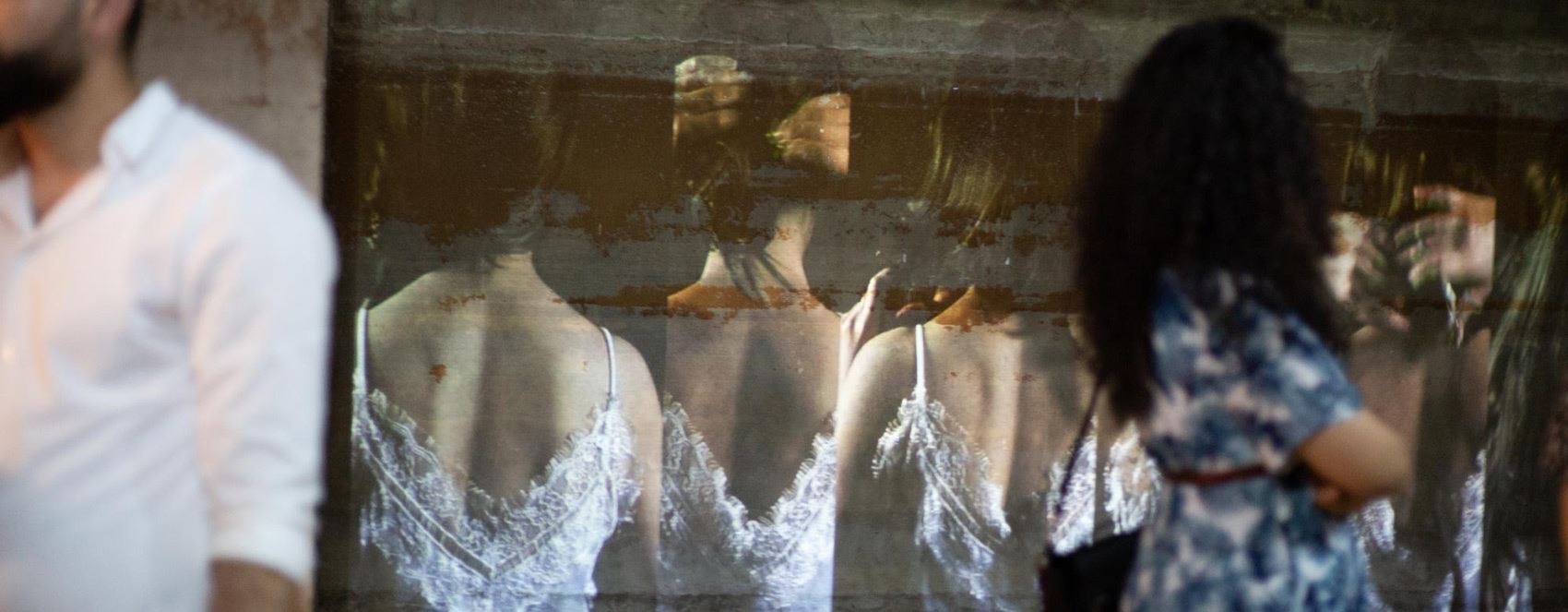 A woman pours chocolate over herself, the image of another woman in solitary confinement breaks into pieces. In the next photo, a woman changes her form every day. Opposite photos of women whose faces were disfigured is a woman in a white dress arranging her hair. The sound of high heels can constantly be heard over the echoes of the murmurs of both young and mature people in the audience in a hot and dimly lit basement of prison cells and cells of solitary confinement.