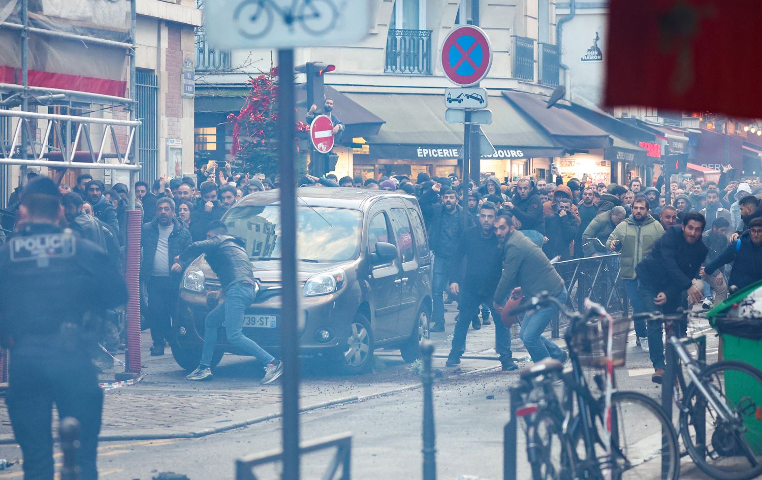 Protestors clashes with French riot police officers following a statement by French Interior Minister at the site where several shots were fired along rue d'Enghien in the 10th arrondissement, in Paris on December 23, 2022. Photo: Thomas Samson/AFP