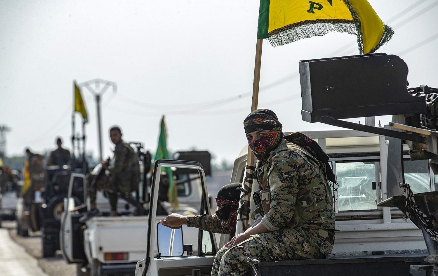 Fighters from the Syrian Democratic Forces (IDF) gather in their military vehicles as they withdraw from the Sanjak Saadoun border area near the northern Syrian town of Amuda, October 27, 2019. Photo: Delil Souleiman / AFP