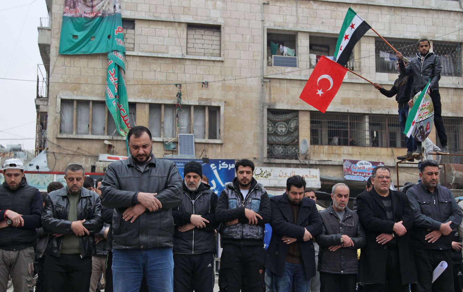 Syrians in the northwestern city of Idlib perform funerary prayers on February 28, 2020 for Turkish soldiers killed the previous day in a Syrian government air strike. Photo via Abdulaziz Ketaz / AFP