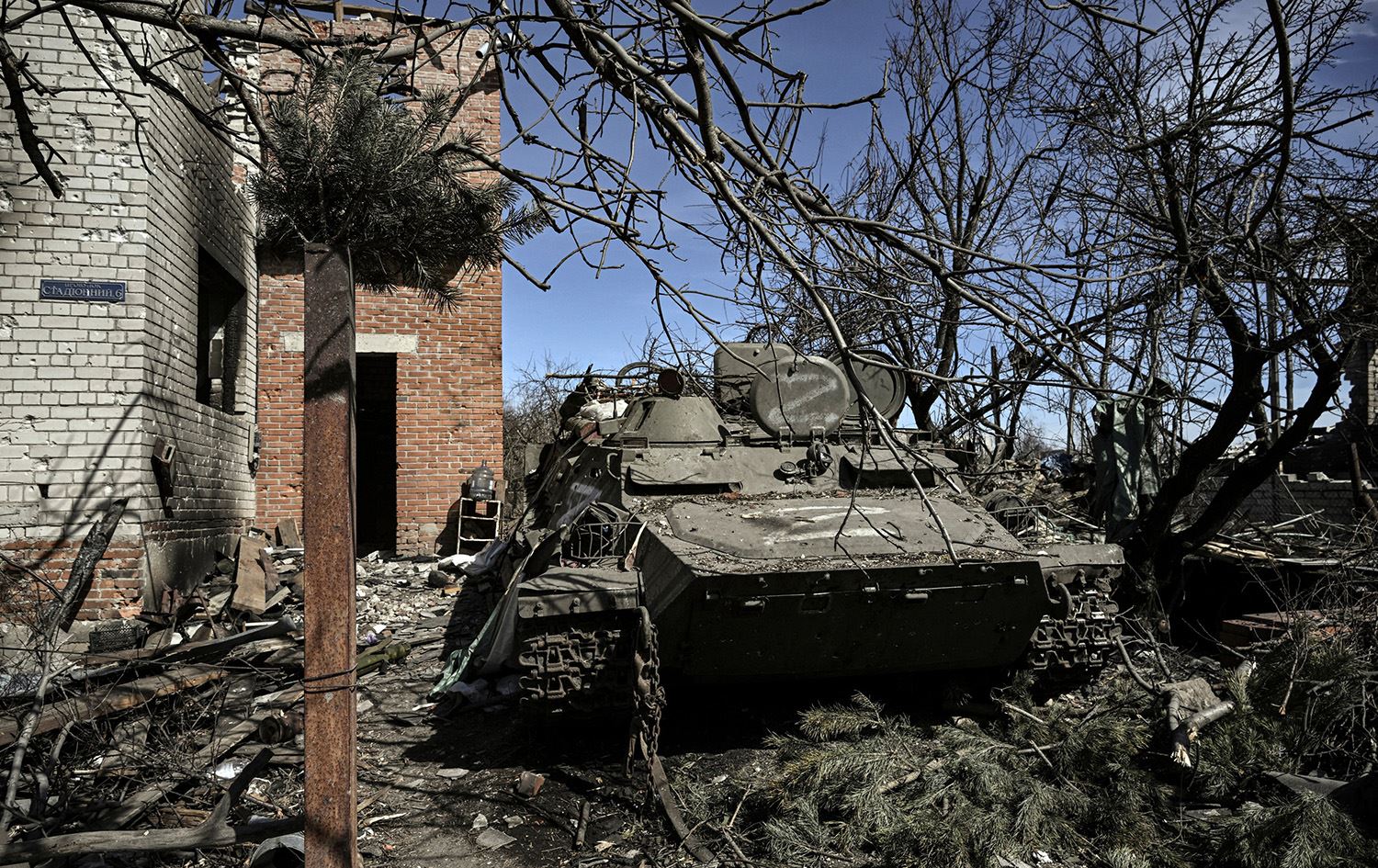 An abandoned Russian armoured vehicle captured on March 28, 2022 in the village of Mala Rogan in Kharkiv. Photo: Aris Messinis/AFP