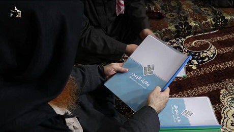 In this still from an 18-minute clip posted by ISIS media on messaging app Telegram, Baghdadi is purportedly shown reading documents about ISIS activities across the world. This document reads: "Yemen Villayet: Monthly Report." April 29, 2019. Photo: ISIS media / Telegram