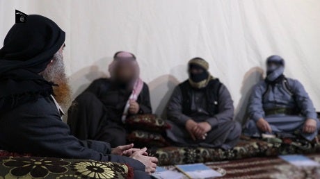 In this still from an 18-minute clip posted by ISIS media on messaging app Telegram, Baghdadi is purportedly shown seated with several lieutenants. April 29, 2019. Photo: ISIS media / Telegram