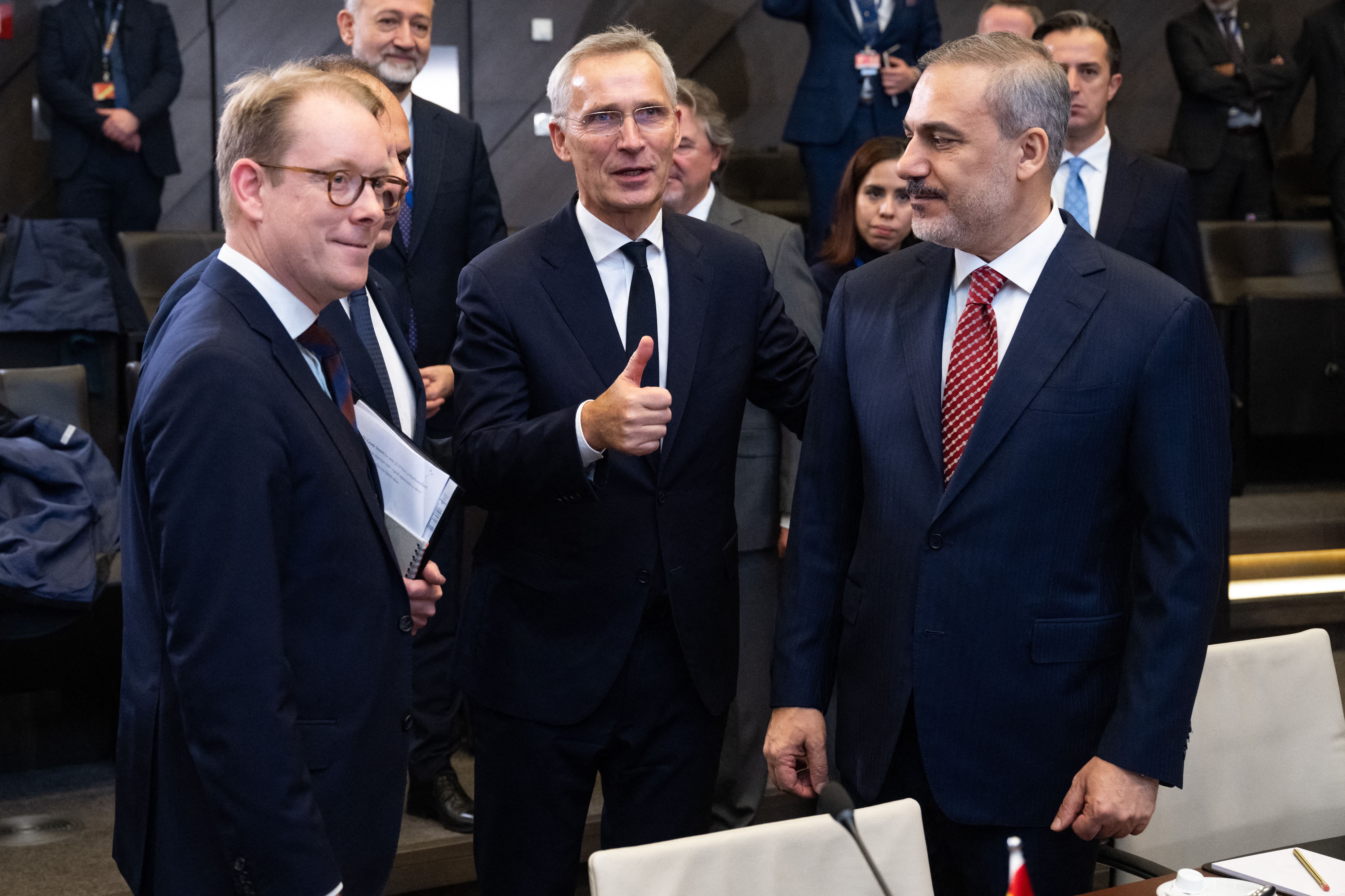 NATO Secretary General Jens Stoltenberg (C) speaks with Turkish Foreign Minister Hakan Fidan (R) and Swedish Foreign Minister Tobias Billstrom (L) prior to the start of the NATO foreign ministers meeting in Brussels on November 28, 2023. Photo: AFP