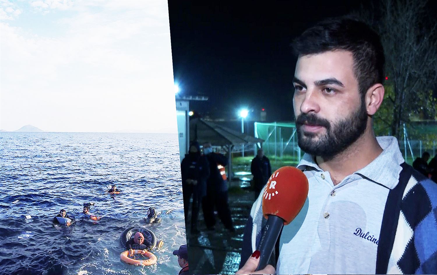 Migrants being rescued after their boat sank in the Aegean Sea, off the coast of southwestern Turkey on June 17, 2019 (left). File Photo: AFP; Surviving migrant Fryad Ali speaking to Rudaw from Greece on December 28, 2021 (right). Photo: screenshot; Graphics: Rudaw