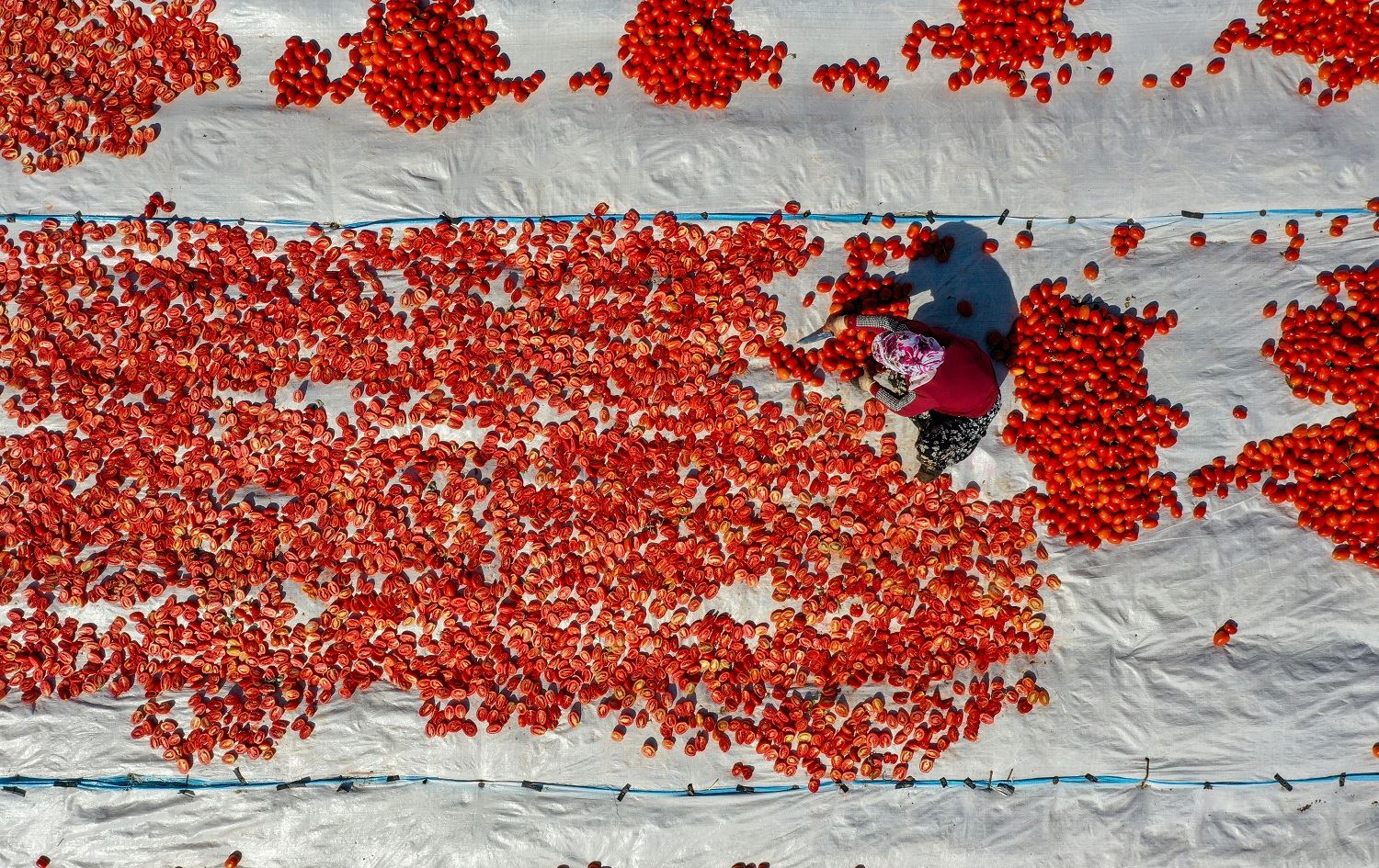 Karker serê sibehê zû radibin û di bin germahiya 40 pileyî de bacanên sor li ber rojê radixin da ku hişk bibin.