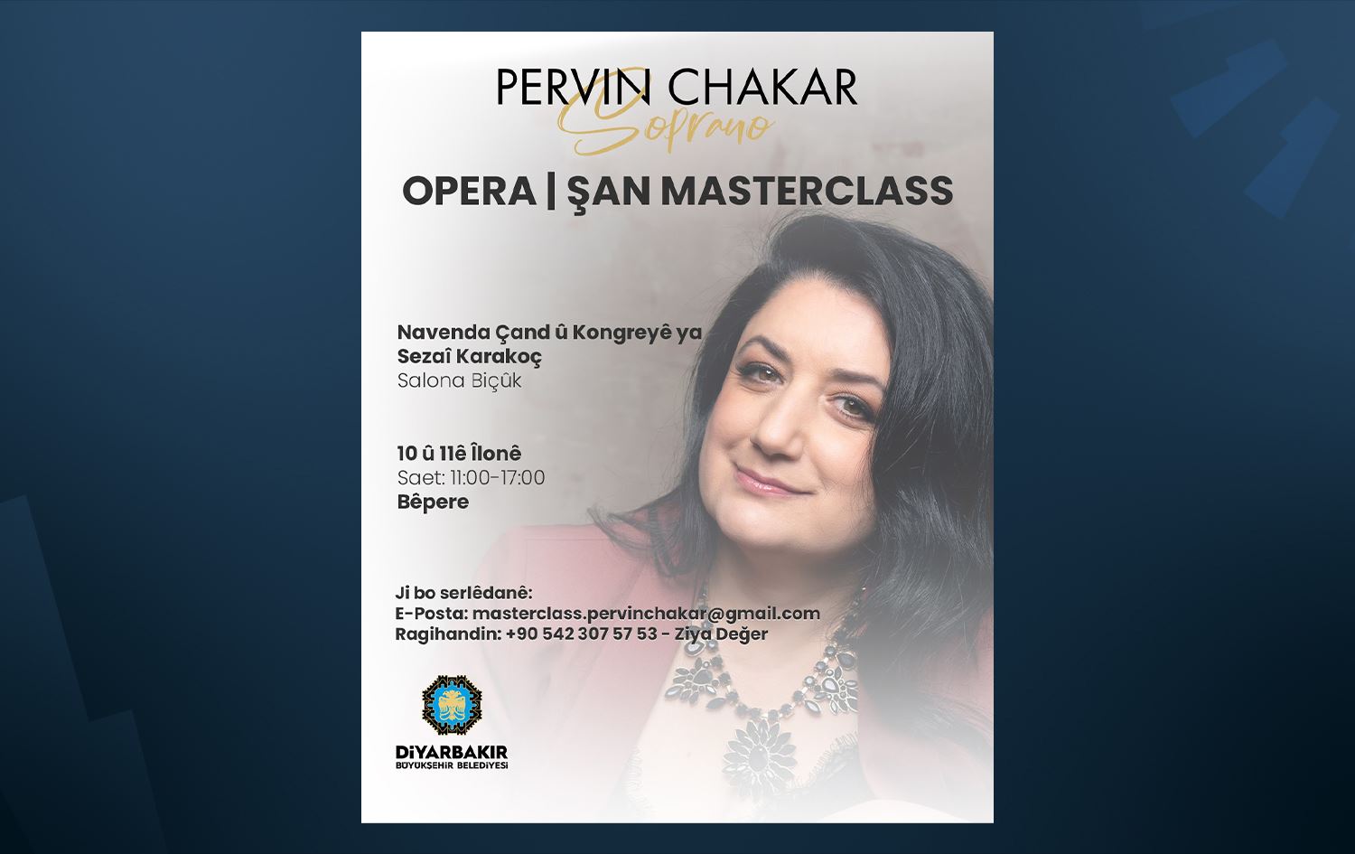 📌 Dünyaca ünlü Opera/Şan sanatçısı Pervin Chakar, 10-11 Eylül tarihlerinde Çand Amed Kültür ve Kongre Merkezi’nde 2 günlük masterclass eğitimi verecek. 18-30 yaş arası seçilecek 10 genç yetenek, Chakar’dan birebir… pic.twitter.com/ZZjwUskrBq