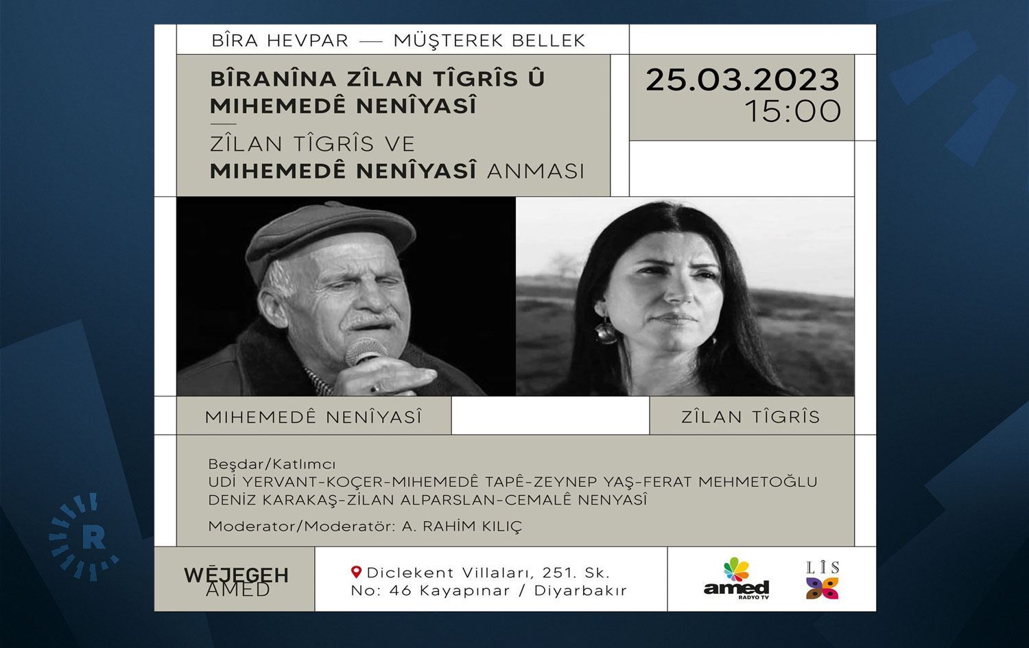 Em #MihemedêNenîyasî û #ZîlanTîgrîs, bi beşdarîya dostên wan wekî Udi Yervant, Koçer, Mihemedê Tapê, Zeynep Yaş, Ferat Memetoğlu, Deniz Karakaş, Zilan Alparslan ve Cemalê Nenîyasî û bi moderatorîya A. Rahim Kılıç, roja 25’ê Adarê saet di 3:00’yan de, li Wêjegeh Amedê, yad dikin pic.twitter.com/h0HRvQIhCI