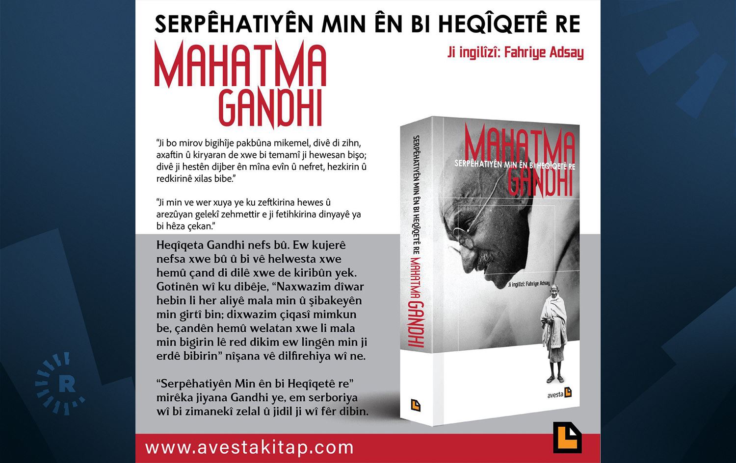 Rêveberê Giştî yê Weşanên Avestayê Evdilla Keskîn ji Rûdawê re ragihand ku pirtûka ku Mahatma Gandhî “Serpêhatiyên Min ên bi Heqîqetê re” ji aliyê Fahriye Adsayê ve ji Îngilîzî ji bo zaraveyê Kurmanciyê yê Kurdî hate wergerandin.