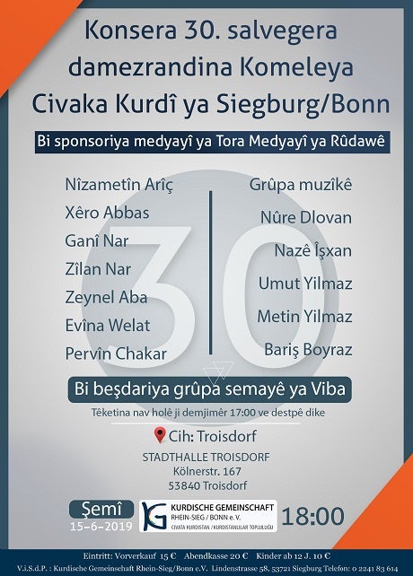 Bonn (Rûdaw) – Komeleya Civaka Kurdî ya Siegburg – Bonn ku yek ji kevntirîn komeleyên civaka Kurdî ye û di sala 1989an de hatiye damezrandin, ji bo 30yemîn salvegera damezrandinê, bi amadekariyên sazkirina konsertekê ve mijûl e.