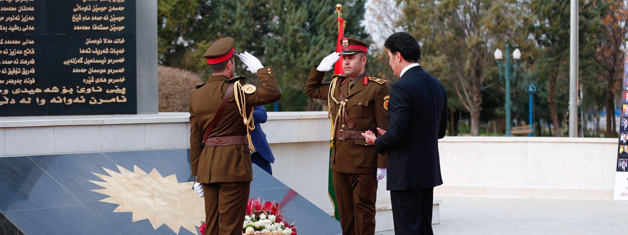 Di wê merasîma bîranîna qurbaniyên 1ê Sibatê de, Mesrûr Barzanî, Serokwezîrê Hikûmeta Herêma Kurdistanê, tacegulek li ser monumentê danî.