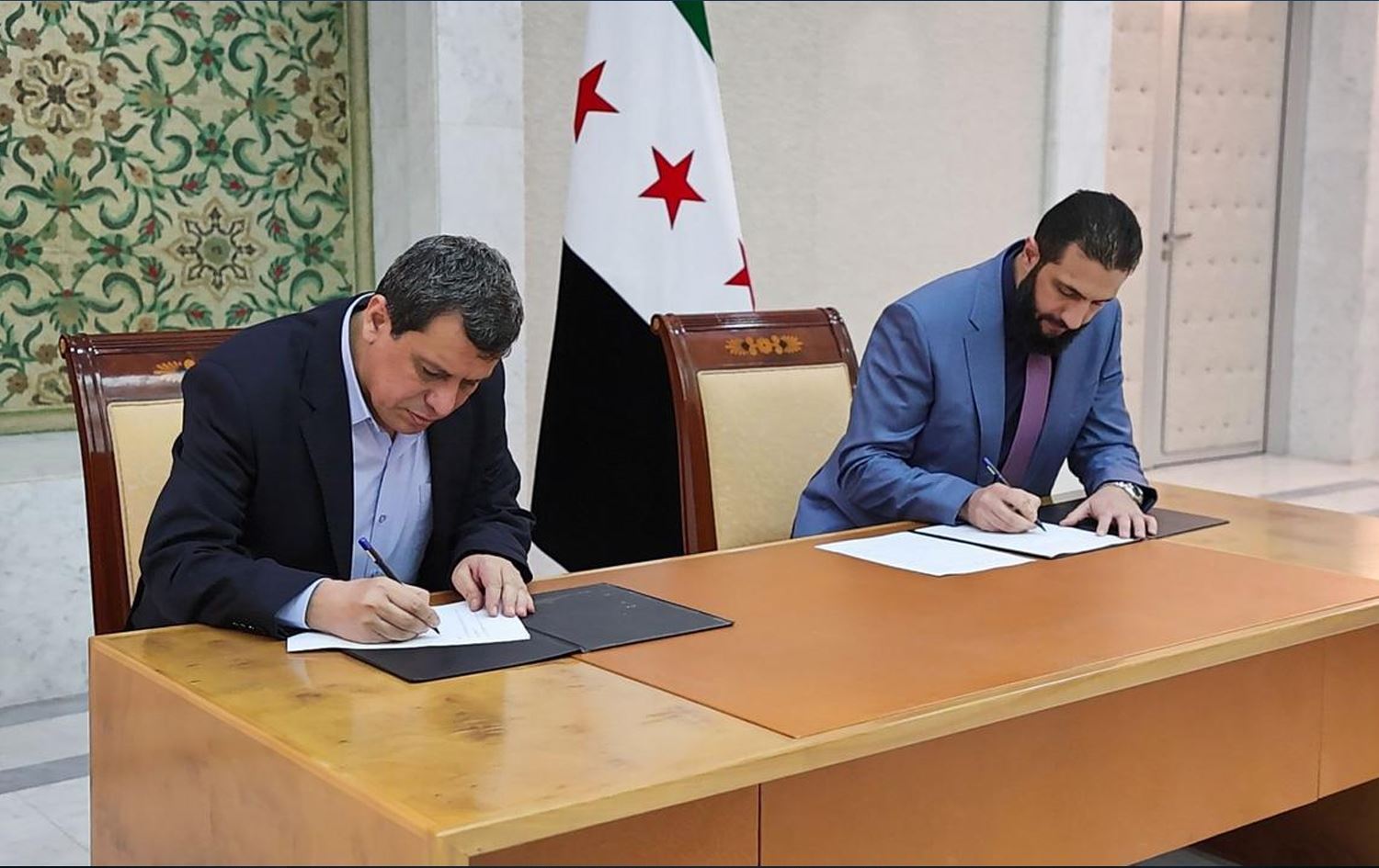 Fermandarê Giştî yê HSDyê Mezlûm Ebdî û Serokkomarê Sûriyeyê Ehmed Şer 10ê Adara 2025an peymaneke ku ji 8 xalan pêk te imze kiribû.