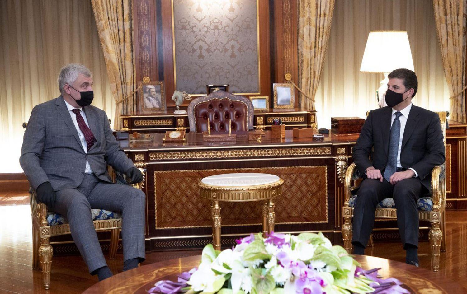 Serokê Herêma Kurdistanê, Nêçîrvan Barzanî û Balyozê Rûsya yê li Iraqê Maksim Maksimov, îro Sêşemî 1ê Kanûna 2020 li Hewlêrê. Wêne: Serokatiya Herêma Kurdistanê