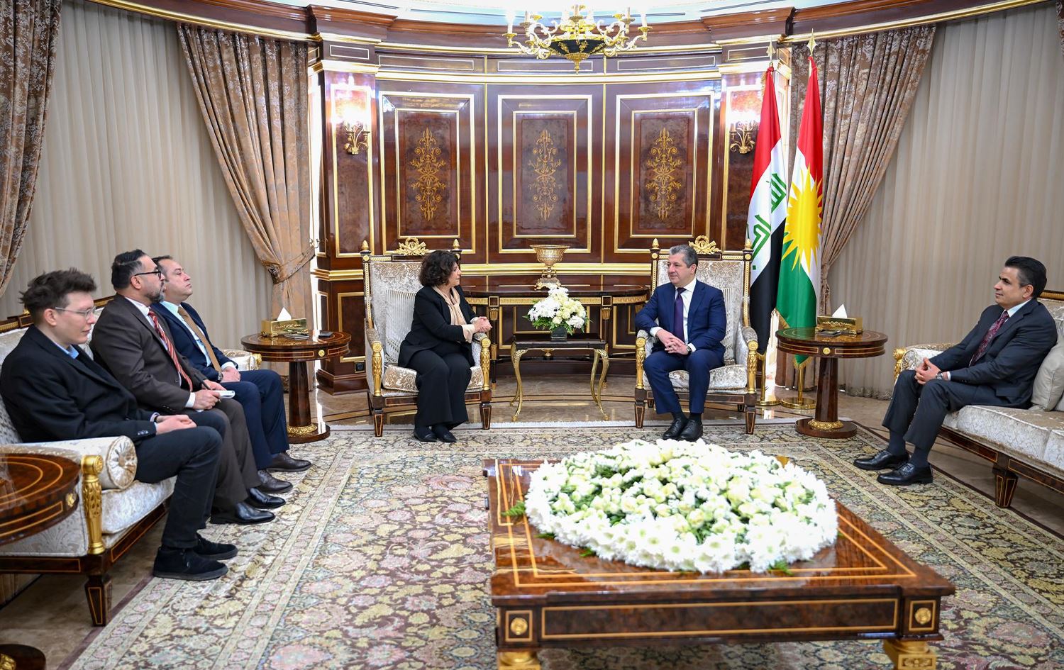Serokwezîrê Herêma Kurdistanê Mesrûr Barzanî li Hewlêrê bi Alîkara Serokê Parlamentoya Herêma Nordrhein-Westfalen a Almanyayê Bêrîvan Aymazê re civiya.