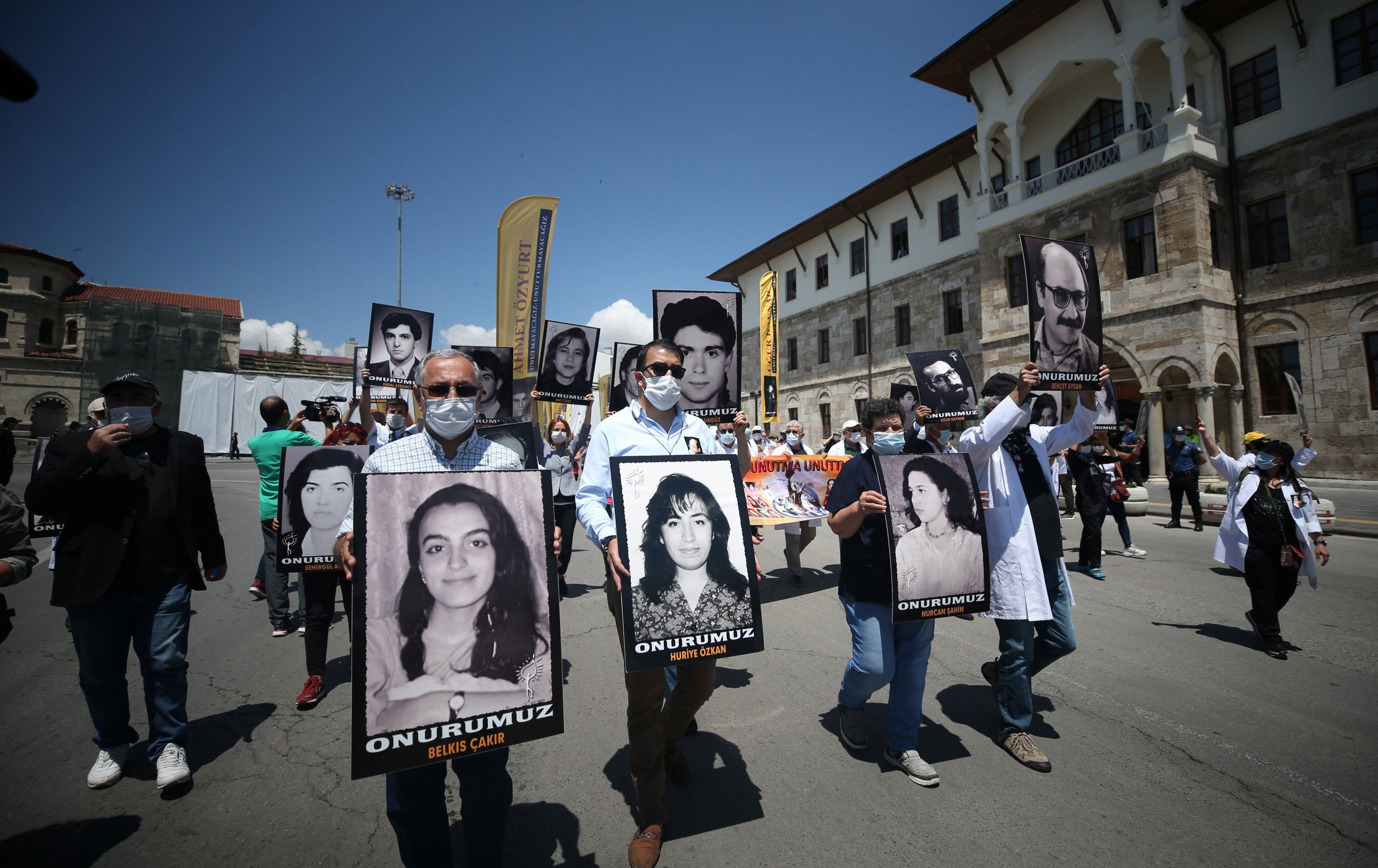 Hejmarek welatiyan wêneyên çend qurbaniyên bûyera şewata li Hotêl Madimak a Sêwazê bilind kirine, 2ê Tîrmeha 2020. Wêne: AA