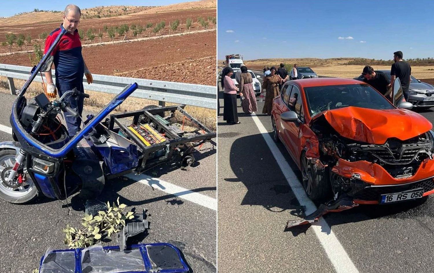Otomobîlek û motosîkleteke sê-teker a bi qese li hev qelibîn.