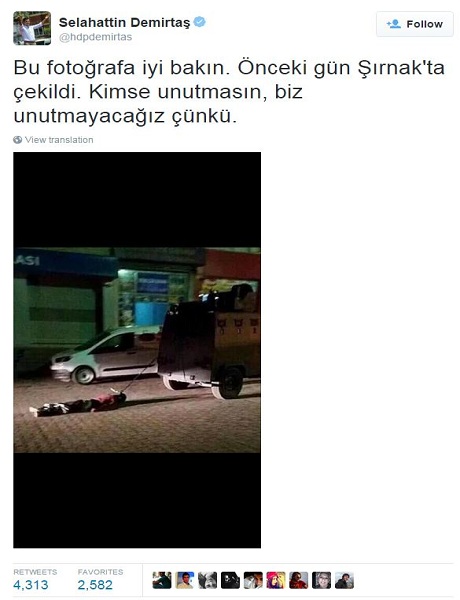 Hewlêr (Rûdaw) – Hevserokê Partiya Demokratîk a Gelan (HDP) Selahedîn Demîrtaş li ser rûpela xwe ya Twîtterê wêneyek belav kiriye ku panzêra polîs kesekî mirî li dû xwe kaş dike. Demîrtaş gotiye, ew wêne “pêr” li Şirnexê hatiye girtin!