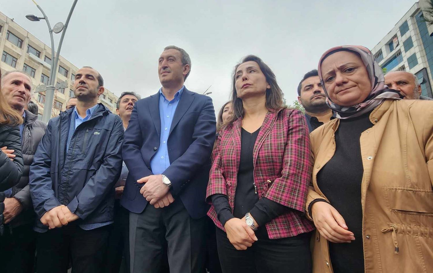 Hevseroka Şaredariya Êlihê Gulîstan Sonuk, Hevserokê Partiya Herêmên Demokratîk (DBP) Keskîn Bayindir, Hevserokê Şaredariya Bajarê Mezin a Amedê Dogan Hatun nûnerên saziyên sivîl li pêş avahiya Şaredariya Êlihê tevlî xwenîşandana tayînkirina qeyûm bûn.