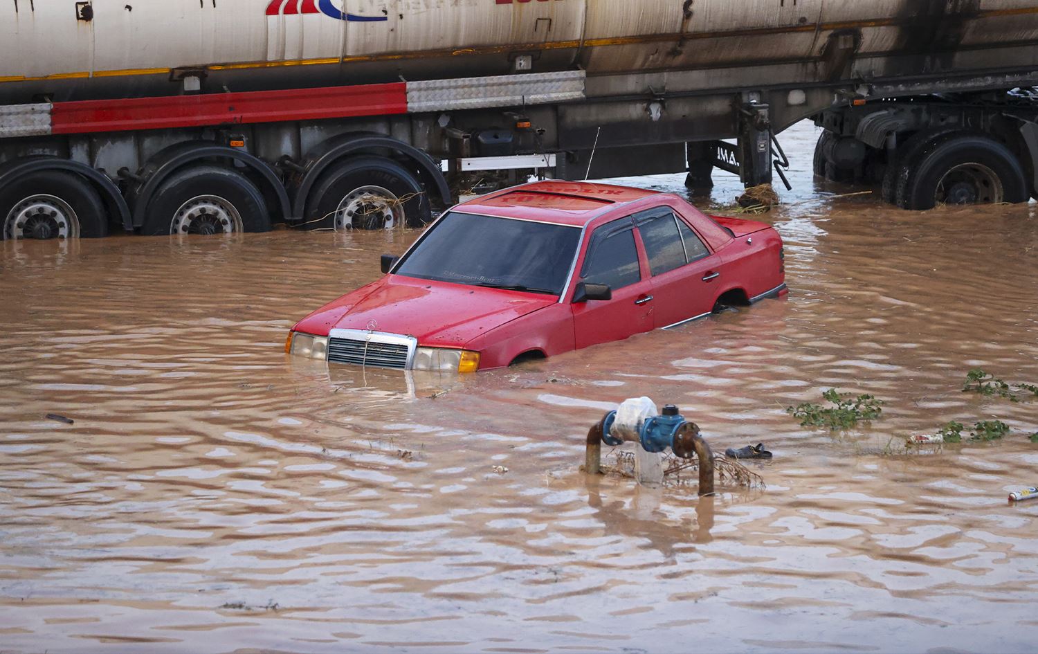 Kolanên bajêr tijî av bûn û gelek otomobîl di nav avê de asê man.