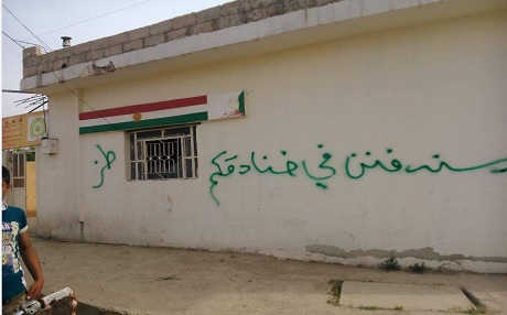 Li gor wêneya ku li ser rûpelên Facebookê belav bûye, li ser dîwarê ofîsa PDK-Sê li Çilaxa bi zimanê erebî hatiye nivîsandine ku “emê we di xendeqan de veşêrin”, wek amajeyekê ji bo xendeqa ki di navbera Başûr û Rojavayê Kurdistanê de tê kolandin.