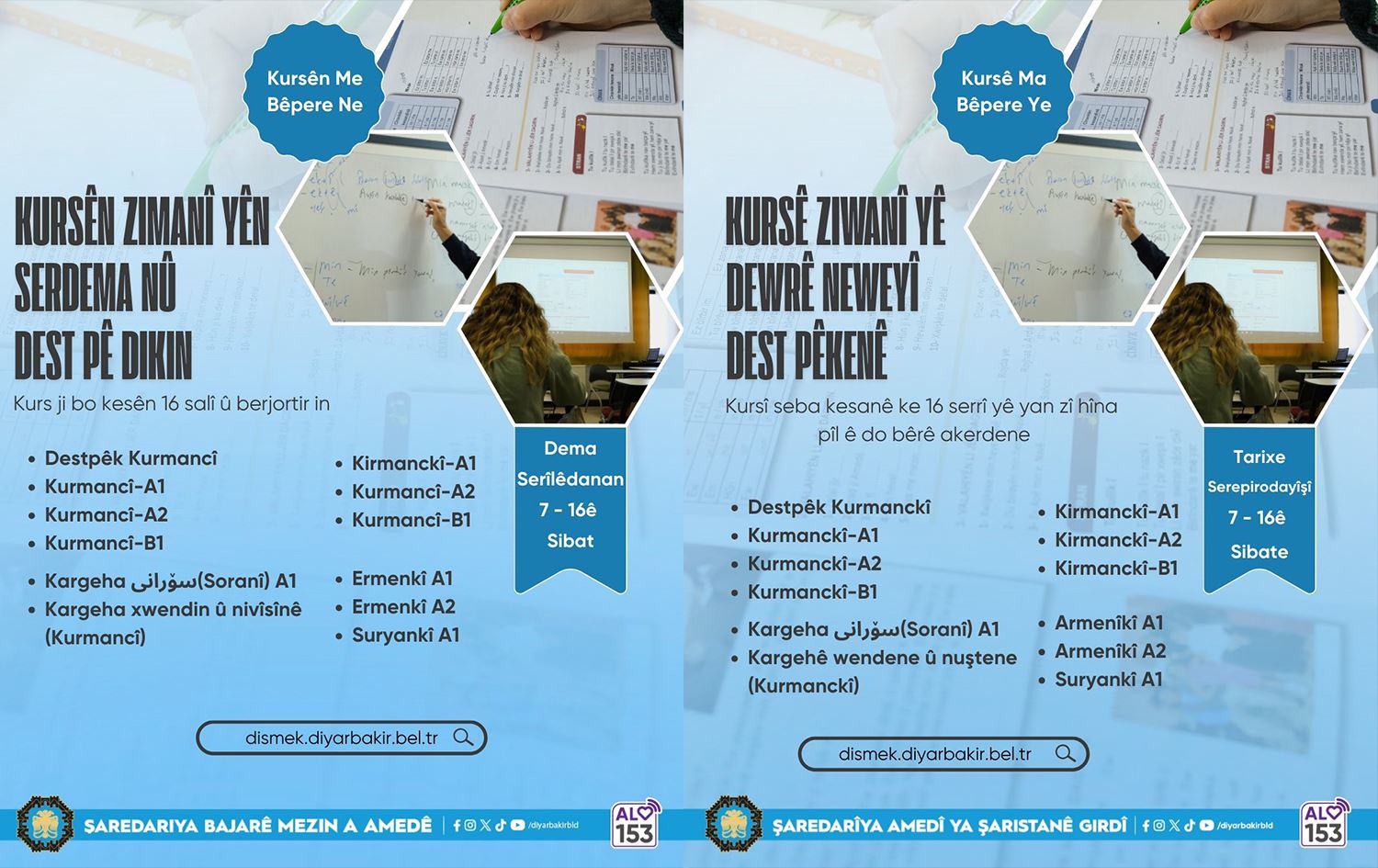 Welatiyên ku dixwazin beşdarî van kursên bêpere bibin, dikarin di navbera 7 û 16ê Sibata 2026an de li ser malpera şaredariyê ya dismek.diyarbakir.bel.tr serlêdanên xwe bi awayekî online bikin.