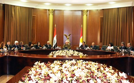 Îro,09.04.2014, Serokê Herêma Kurdistanê Mesûd Barzanî li Pîrmamê pêşwazî li Sekreter û endamên serkirdatiya PDK-Sê, kir.