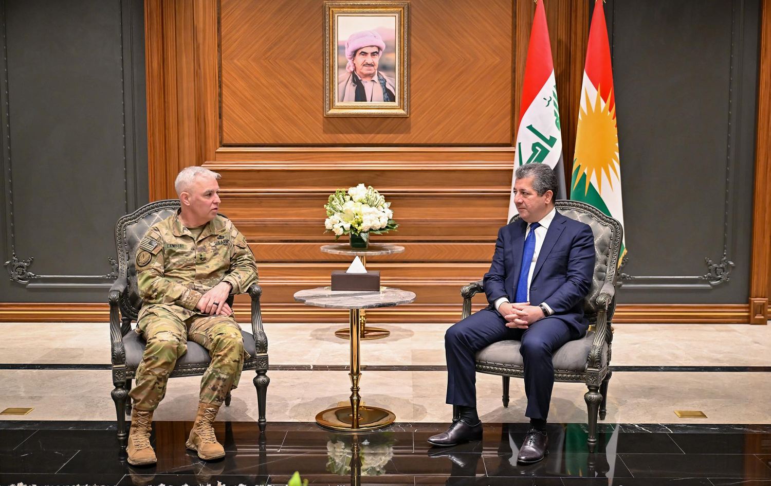 Hewlêr (Rûdaw) - Serokwezîrê Herêma Kurdistanê Mesrûr Barzanî, Fermandarê Giştî yê Hêzên Hevpeymaniya Navneteweyî ya li Dijî DAIŞê General Kevin Lambert pêşwazî kir.