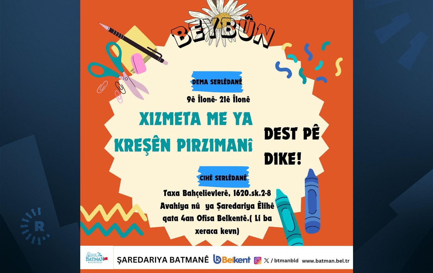 Serlêdan li Ofîsa Belkentê ya li Avahiya Pêvekê ya Xizmetê a li Taxa Bahçelîevler dê werin qebûlkirin.