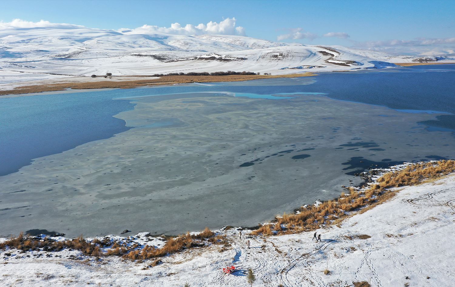 Geştiyarên biyanî û navxwe tên vê derê. Ez jî ji bo wêneyên bigirim hatim. Gola Çildirê niha bi temamî qeşa negirtiye û beşeke wê qerisiye.