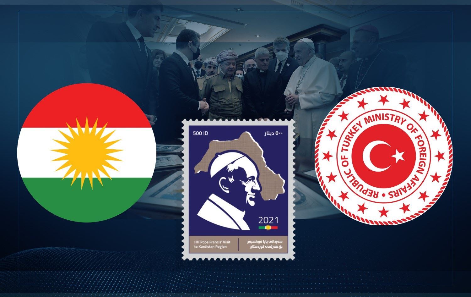 Wezareta Derve ya Tirkiyê dibêje, “di dema serdana Papa Francis de çend pulên bîranînê ji aliyê hikûmeta Herêma Kurdistanê ve hatine çapkirin û hejmareke bajarên Tirkiyê jî di nava wê nexşeyê de hene, lewra divê hikûmeta Herêmî ya Bakurê Iraqê di derbarê sererastkirina wê şaşîtiya xirab de demildest pêngavên şênber bavêje.”