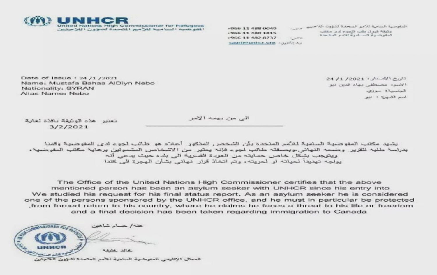 Êvarê kesek telefonê ji wan re vedike û bi erebî dibêje ku ew ji aliyê Neteweyên Yekbûyê ve telefon dike û navê wan ji bo çûna Kanada derketiye.