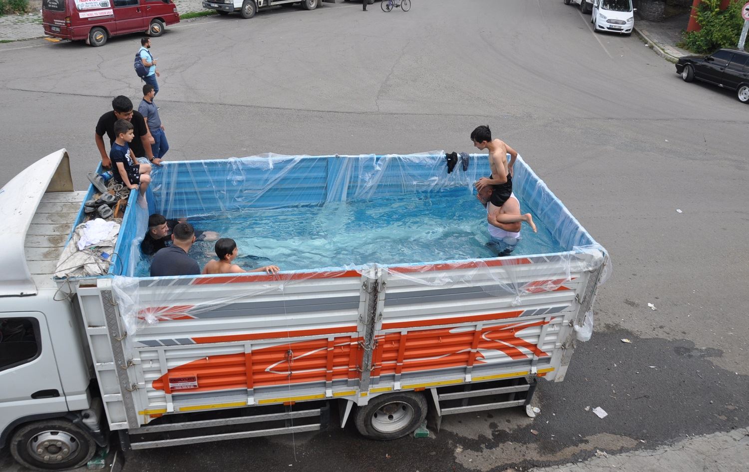 Li Taxa Yusufpaşayê ya Qersê hosteyê camên otomobîla Alican Kaya ji bo karker û zarokên xwe yên ji ber germê tengezar bûne, qaseya kamyoneta xwe kir hewza avê.