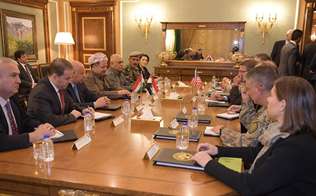 Êvariya roja yekşem 11ê Kanûna 2016ê, li Firokexaneya Navdewletiya Hewlêrê Serokê Herêma Kurdistanê Mesûd Barzanî pêşwazî li Wezîrê Berevaniya Amerîka Ashton Carter û şandeke pê re ku ji Cîgira Wezîrê Berevanî Elissa Slotkin û Balyozê Amerîka li Iraq Douglas Silliman û Fermandeyê Hêzên Amerîka li Iraqê û hejmarek ji berpirs û şêwirmendên Wezareta Berevaniya Amerîkayê pêkhatibû.