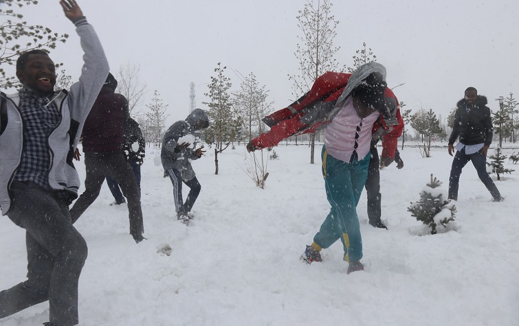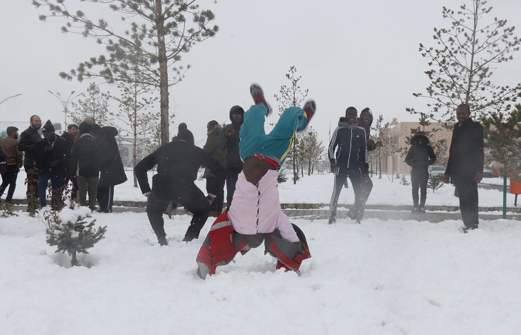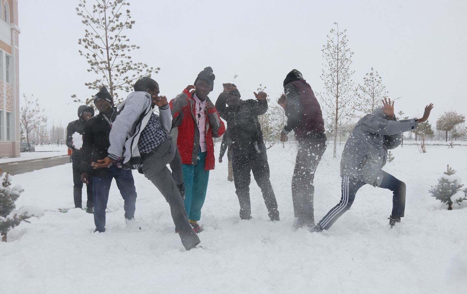 Xwendekarên ku ji Nîjerya, Somalî, Endonezya û Malezya çûne bajêrê Agirî, li ser berfa ku cara ewil dîtin xwe dirêj kirin û kêfa berfê derxistin.